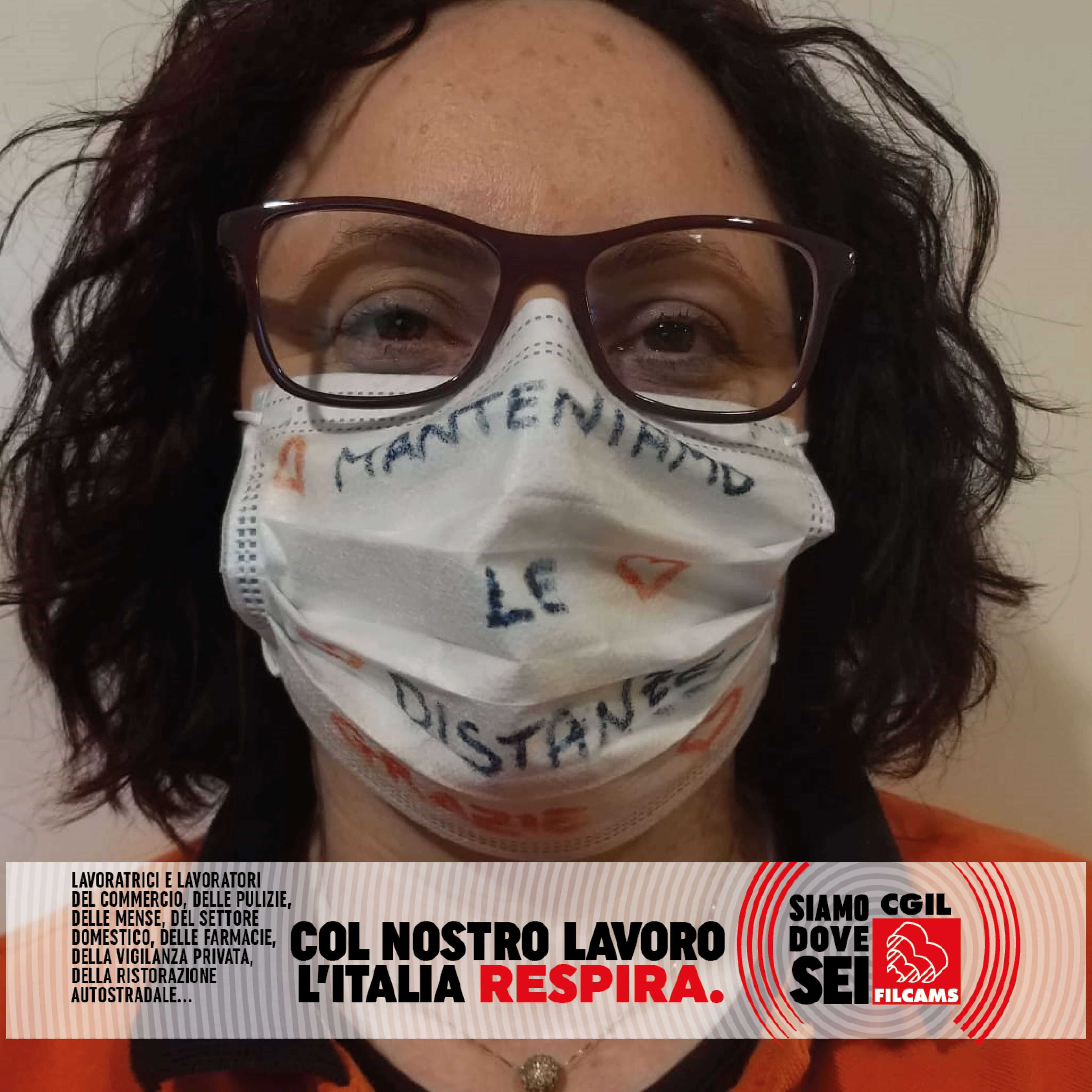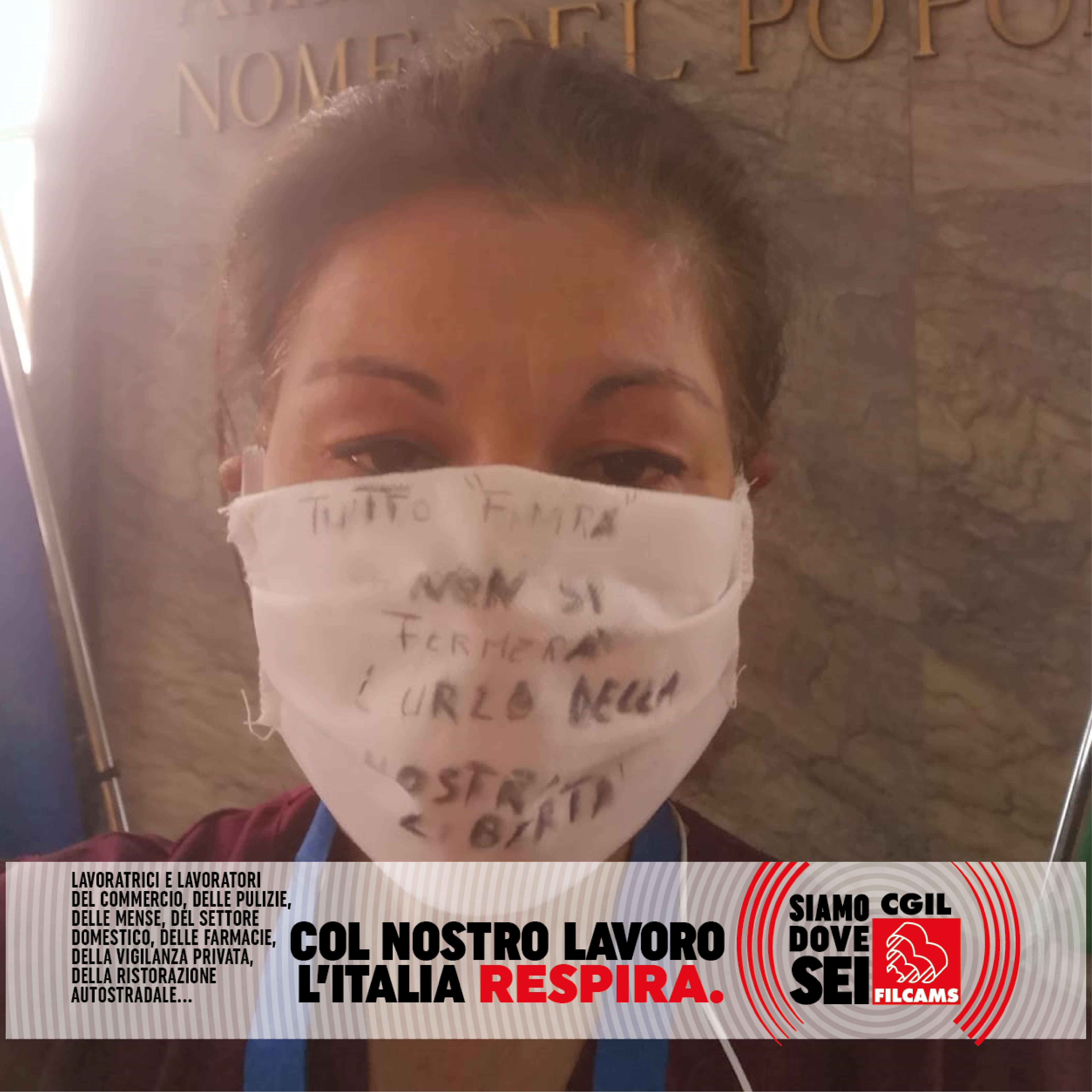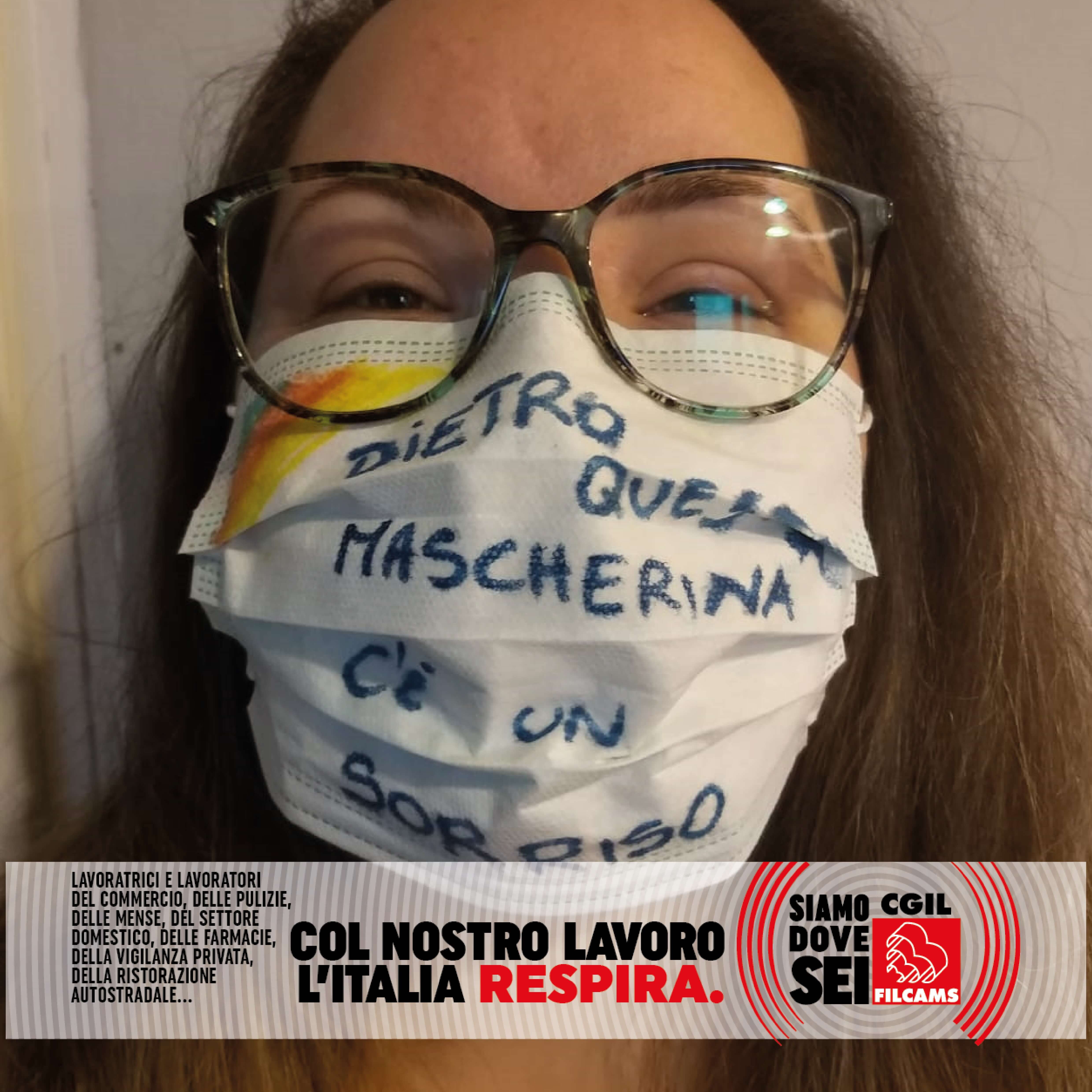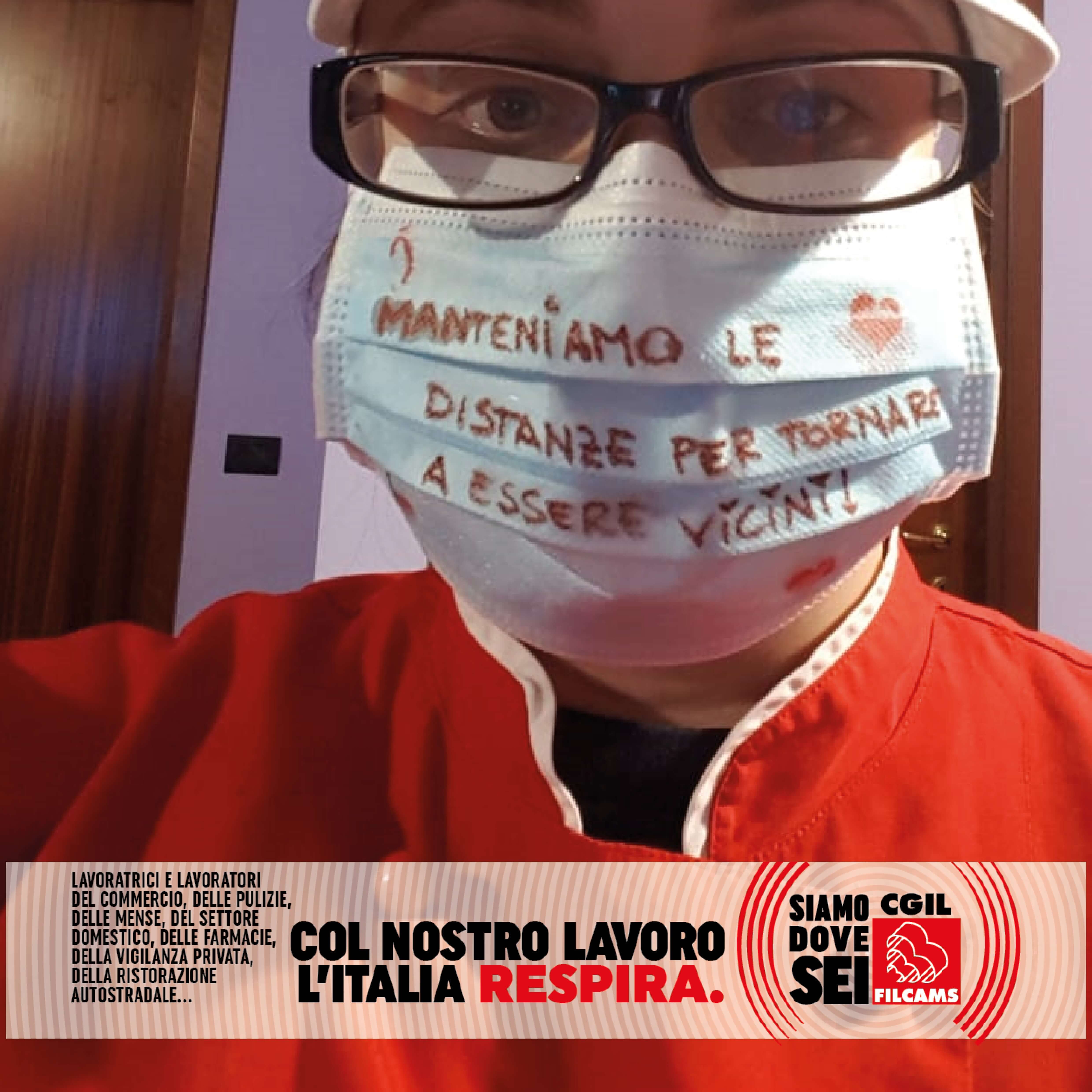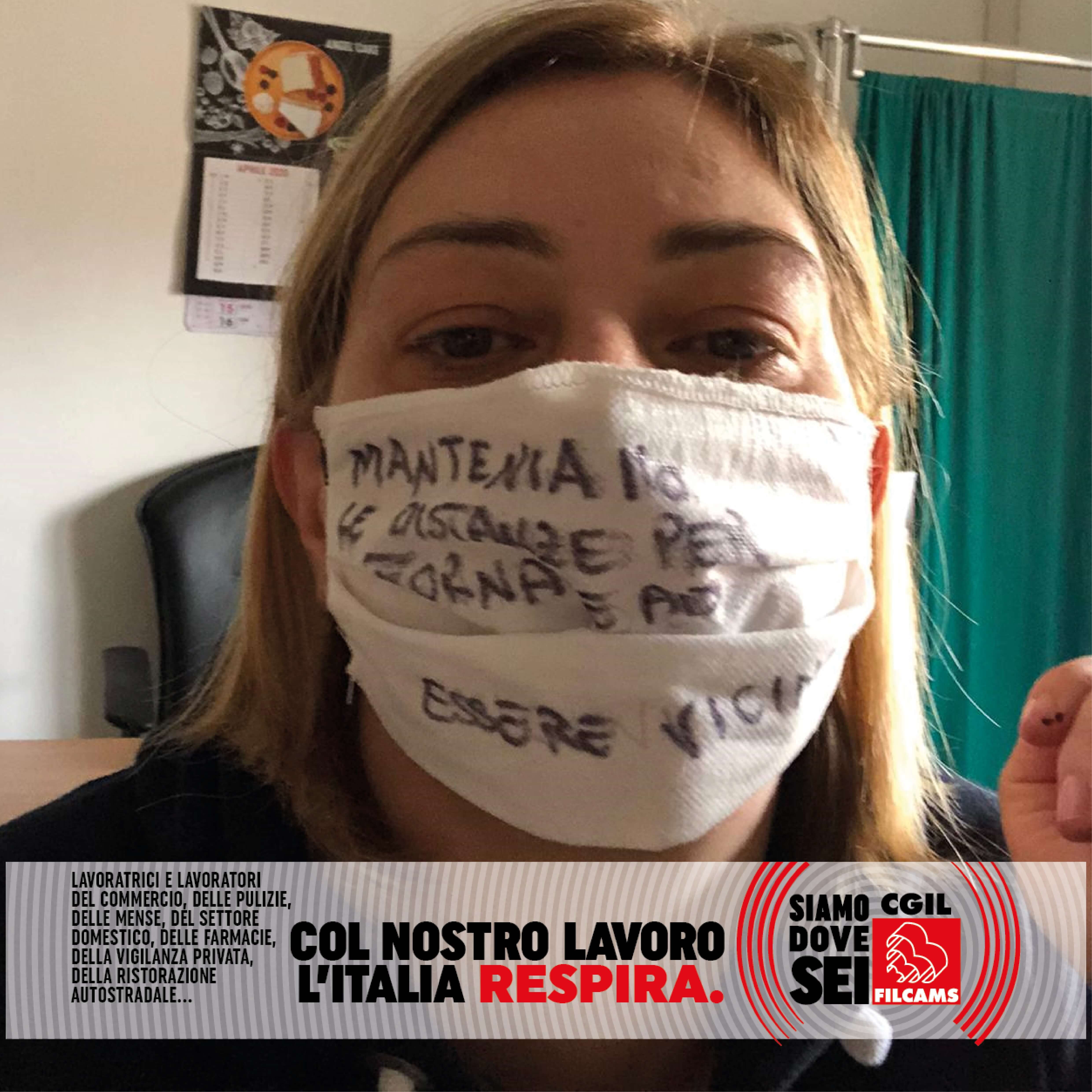 Le lavoratrici e i lavoratori del commercio, delle pulizie, delle mense, del settore domestico, delle farmacie, della vigilanza privata, della ristorazione autostradale, in prima linea durante l’emergenza sanitaria, lanciano i loro messaggi per ripartire in sicurezza: una foto con la mascherina con sopra un messaggio, una frase o un consiglio.