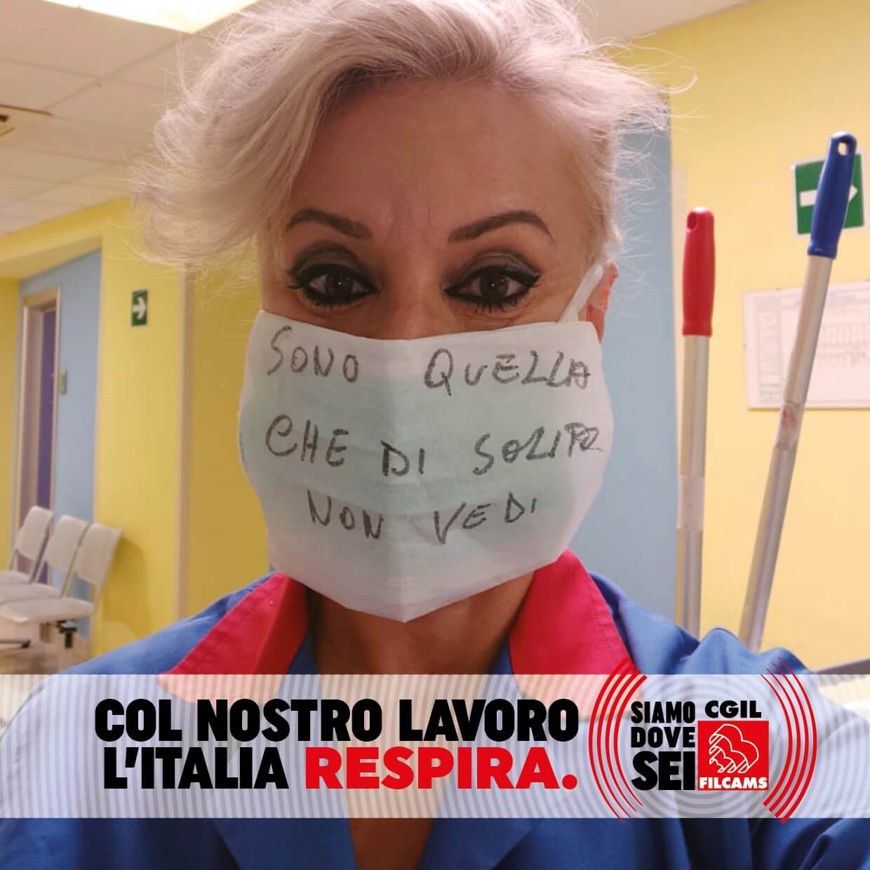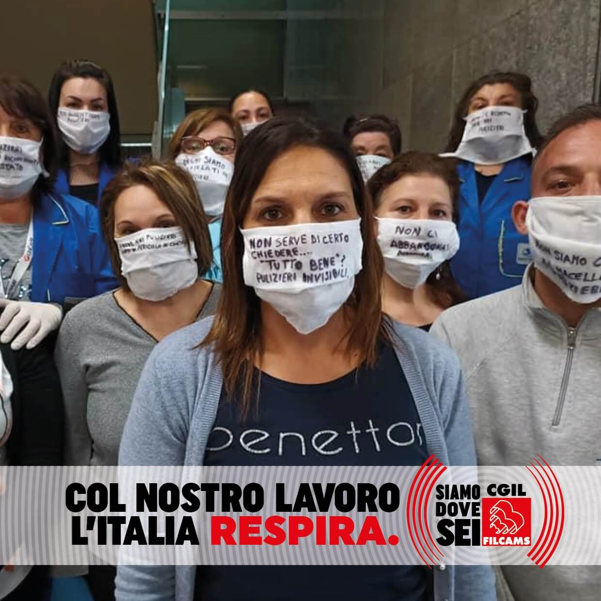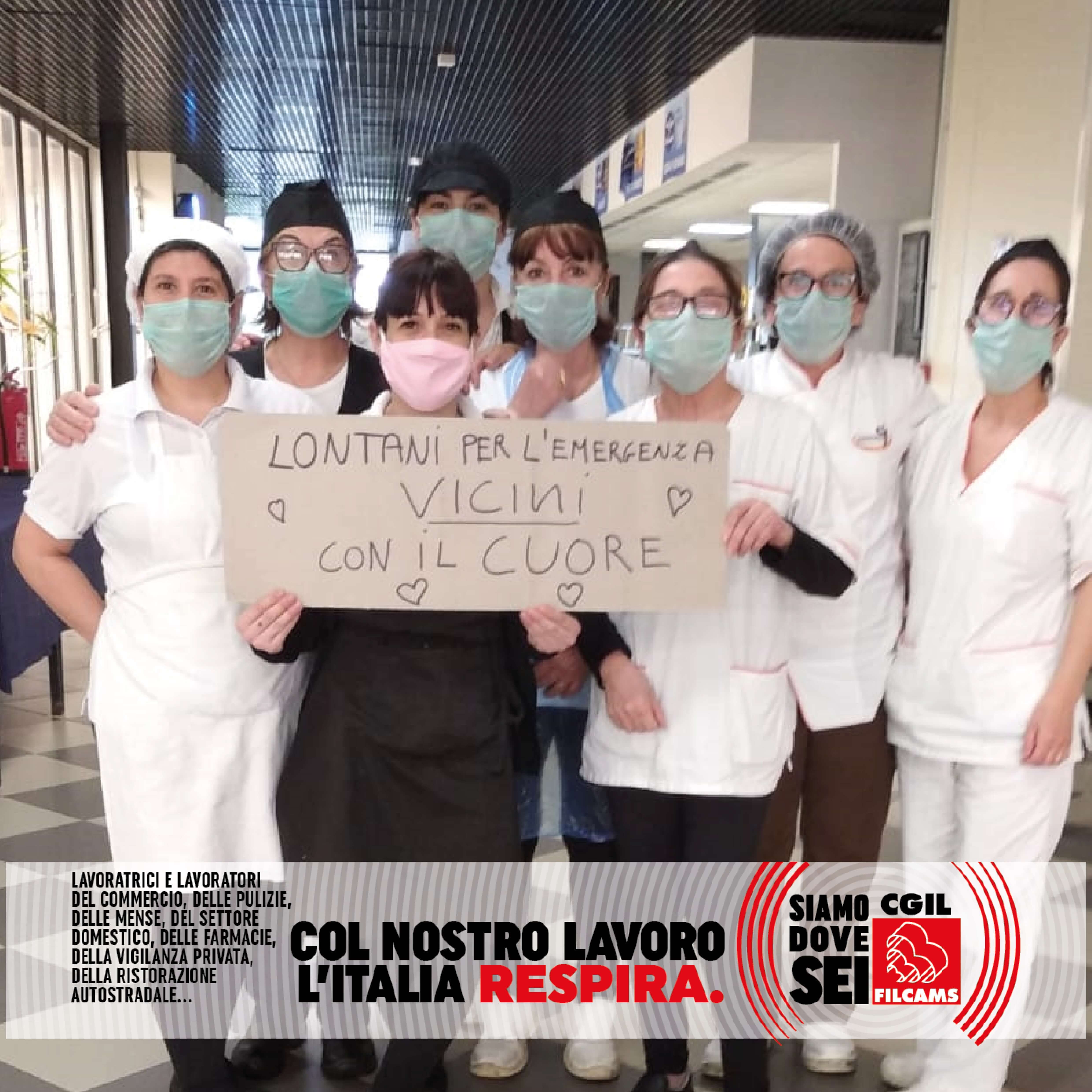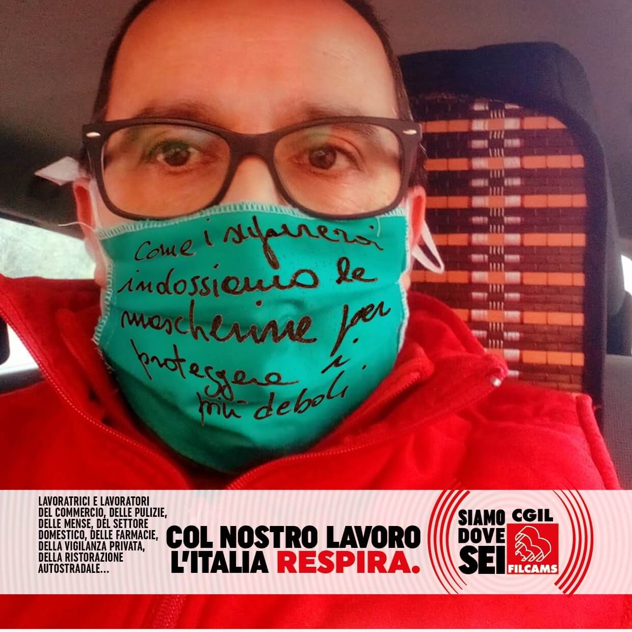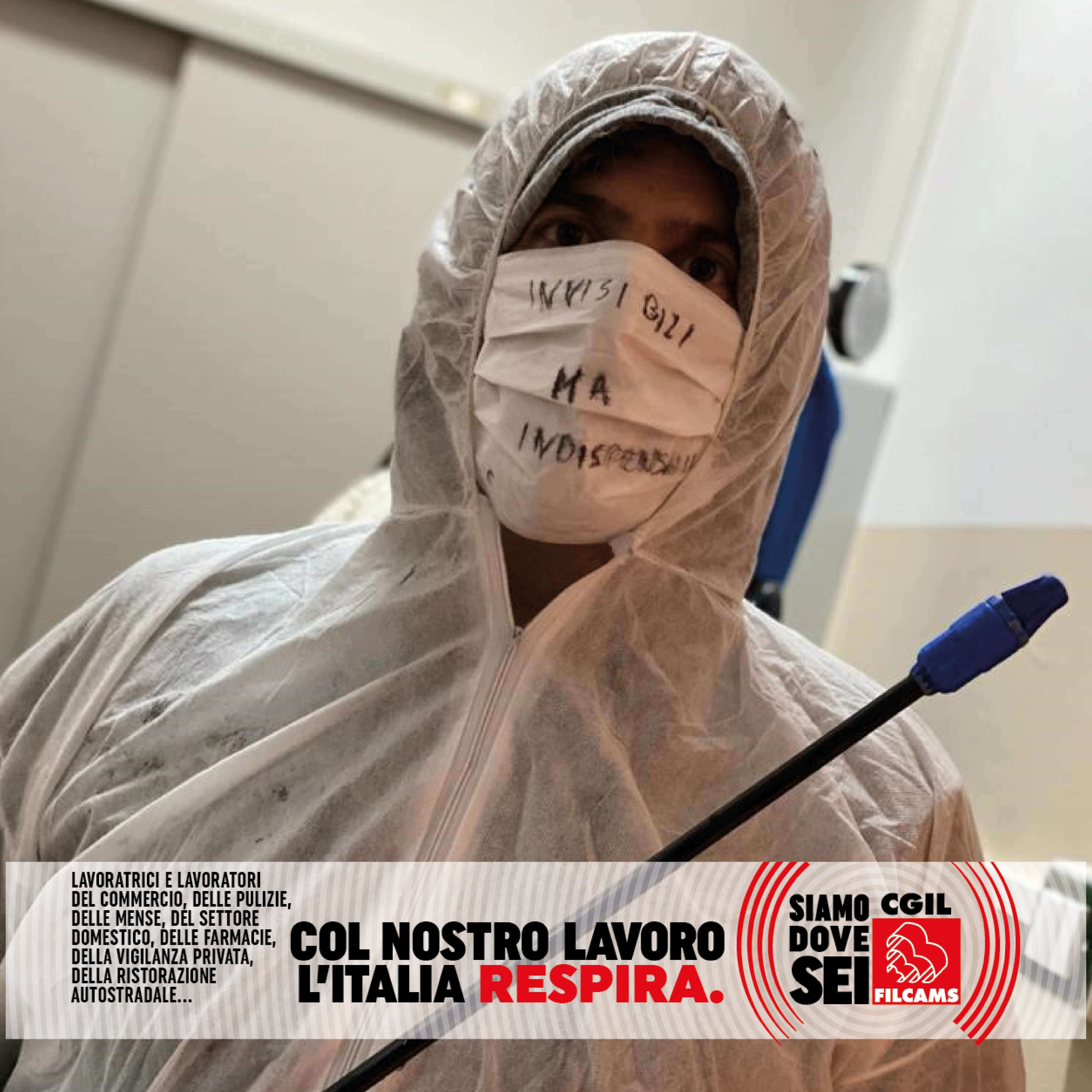 Le lavoratrici e i lavoratori del commercio, delle pulizie, delle mense, del settore domestico, delle farmacie, della vigilanza privata, della ristorazione autostradale, in prima linea durante l’emergenza sanitaria, lanciano i loro messaggi per ripartire in sicurezza: una foto con la mascherina con sopra un messaggio, una frase o un consiglio.