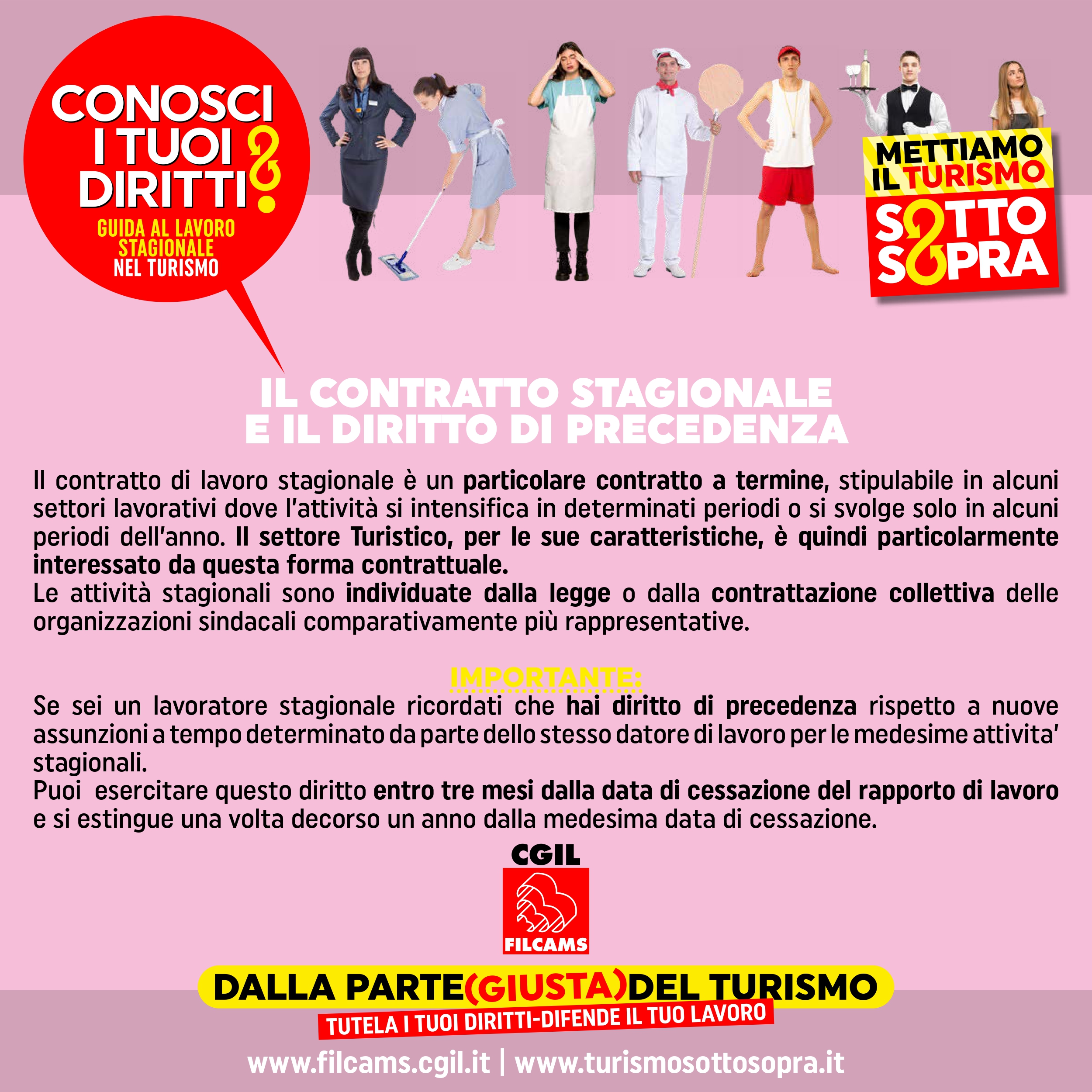 IL CONTRATTO STAGIONALE E IL DIRITTO DI PRECEDENZA.Il contratto di lavoro stagionale è un particolare contratto a termine, stipulabile in alcuni settori lavorativi dove l’attività si intensifica in determinati periodi o si svolge solo in alcuni periodi dell’anno. Il settore Turistico, per le sue caratteristiche, è quindi particolarmente interessato da questa forma contrattuale.