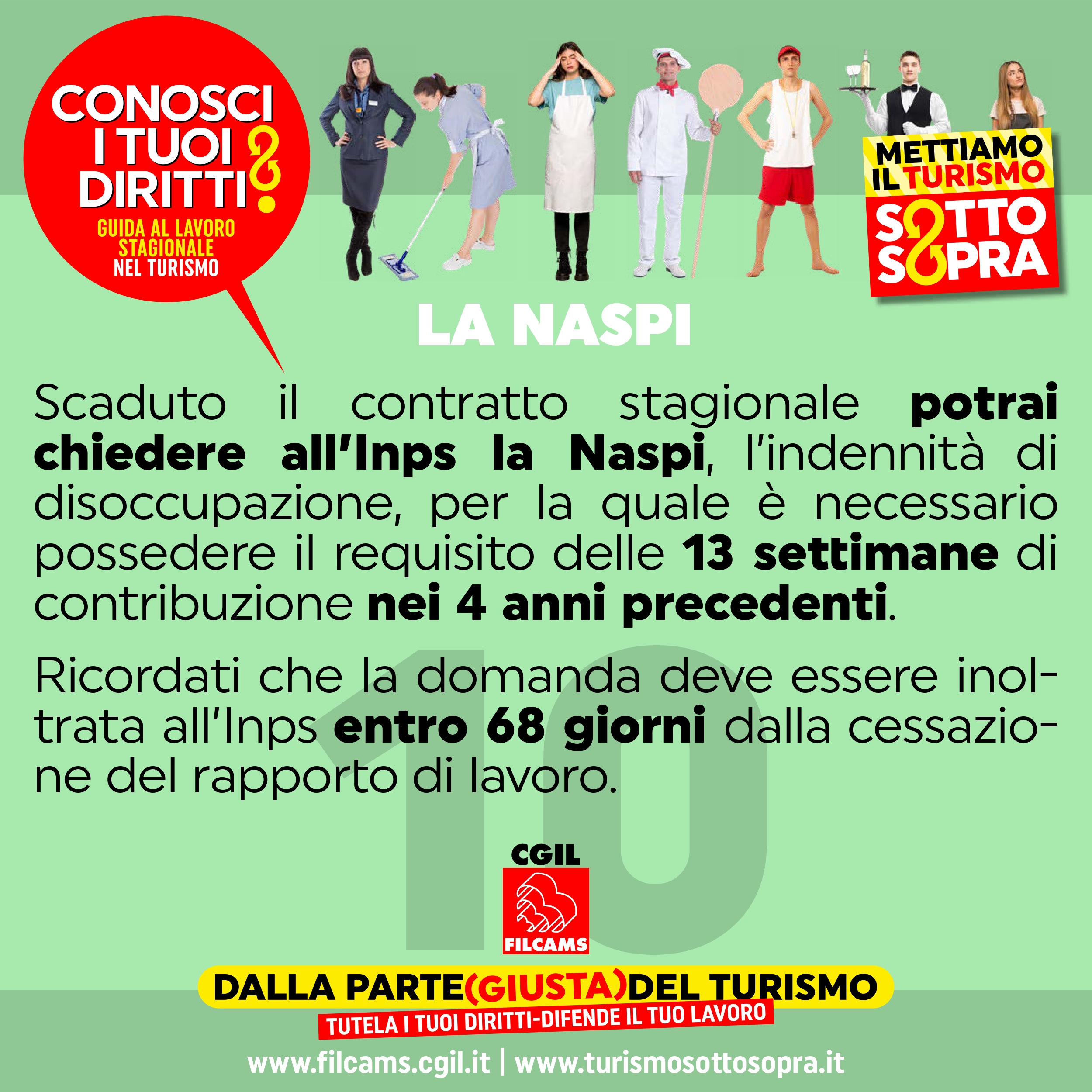 Scaduto il contratto stagionale potrai chiedere all’Inps la Naspi, l’indennità di disoccupazione, per la quale è necessario possedere il requisito delle 13 settimane di contribuzione nei 4 anni precedenti Ricordati che la domanda deve essere inoltrata all’Inps entro 68 giorni dalla cessazione del rapporto di lavoro.