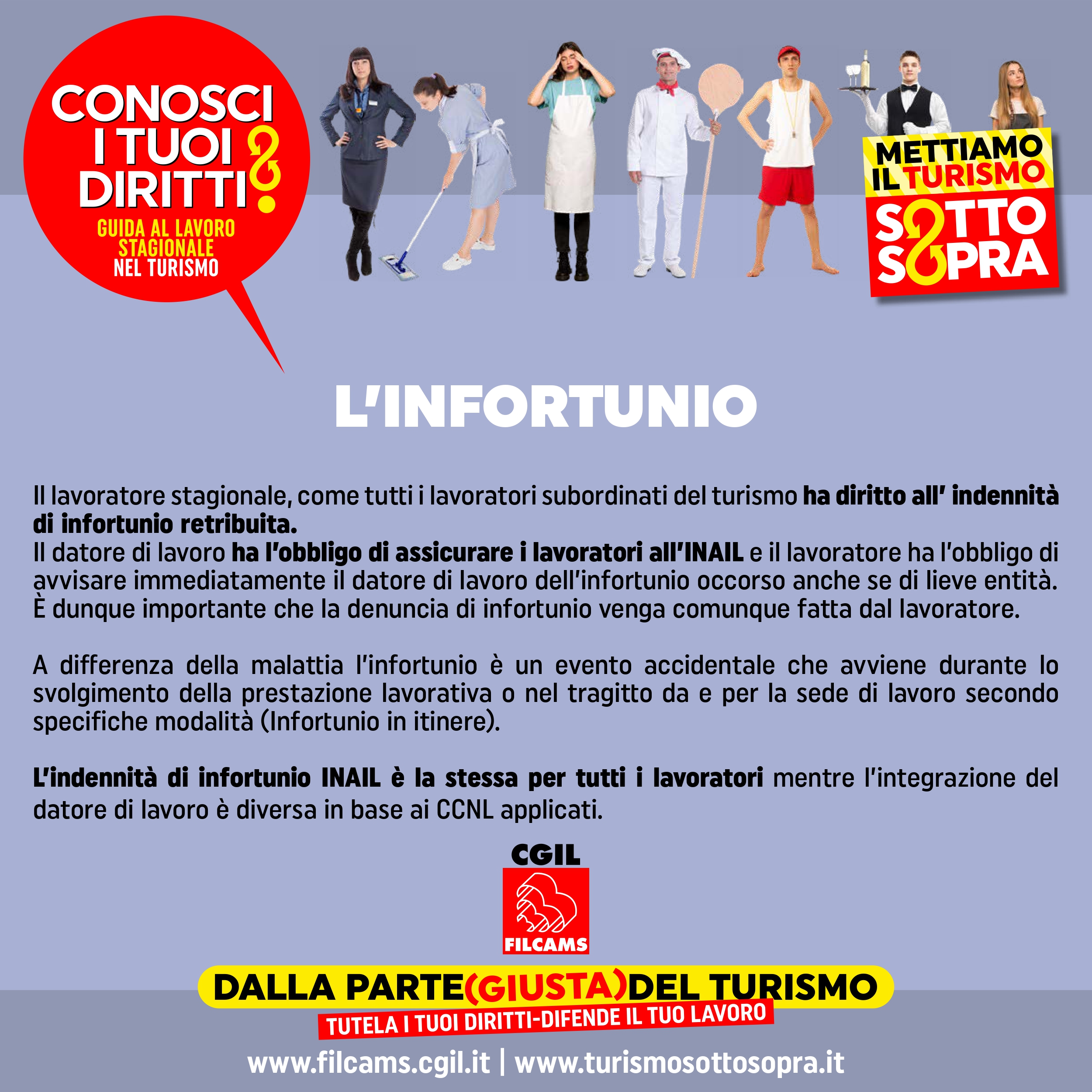 Il lavoratore stagionale, come tutti i lavoratori subordinati del turismo ha diritto all’ indennità di infortunio retribuita.