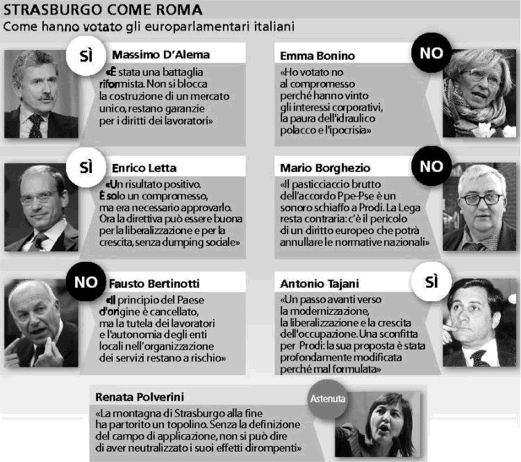Pagina 6 - Primo Piano Stravolte le alleanze inviato a STRASBURGO Polemiche e imbarazzo, soprattutto, sulla tenuta delle alleanze interne. Con un reciproco scambio di accuse che si pu? riassumere con la formula ?il tuo fronte ? pi? spaccato del mio?, all'inseguimento di un consolatorio pareggio. Fuori dall'emiciclo, tra le passerelle di vetro e le piante rampicanti, per una volta si respira il clima elettrico del Transatlantico. Bertinotti parla di ?una brutta storia sia sul terreno dei contenuti, sia su quello della politica?. Anche se non ha voglia di esasperare la rottura e dice che ?per fortuna in Italia ? un'altra cosa?, che ?esiste una radicale contrapposizione fra l'Unione e la destra?. A qualche metro D'Alema definisce ?una battaglia riformista? quella che ?non ha bloccato la costruzione del mercato unico e ha introdotto garanzie per lavoratori e consumatori?. Sulle divisioni nell'Unione, D'Alema replica con una battuta: ?La maggioranza di governo ha votato in tre modi diversi, lo avete notato??. Enrico Letta, della Margherita, approva la direttiva rivista e corretta e nota le divisioni ?sia nel centrodestra che nel centrosinistra?. Nel fronte dei soddisfatti c'? anche Di Pietro che giudica l'accordo tra Ds, Margherita e Italia dei Valori come il segnale che ?il nocciolo duro dei partiti dell'Unione ha maturato la capacit? per governare l'Italia?. Nello stesso schieramento, ma sulla barricata opposta, c'? Monica Frassoni. Per la co-presidente del gruppo dei Verdi, ?Forza Italia, Ds e Margherita si sono messi d'accordo su una direttiva ambigua e pasticciata: se questo ? l'inizio del partito democratico stiamo freschi!?. Marco Rizzo, dei comunisti italiani, ? ancora pi? netto. Dice che ? ?una vergogna che le forze che si richiamano alla cosiddetta sinistra moderata abbiano avallato questa scelta drammatica?. Ha votato no anche Emma Bonino, ma per tutt'altra ragione: della libera circolazione dei servizi ?non ? rimasto in piedi nulla e ha vinto l'ipocrisia?. Nel campo della Casa delle libert?, Antonio Tajani, di Forza Italia, dice che Prodi ?ha fatto l'ennesima brutta figura perch? ? stato smentito dai suoi stessi alleati che hanno mobilitato partiti e sindacati per sconfessarlo?, che la sinistra ha votato ?in ordine sparso, ma nessuna componente ha difeso le sue posizioni?. E il segretario dell'Udc, Lorenzo Cesa, insiste sulle divisioni e sul ?colpevole ritardo? dell'Unione. Di ?sonoro schiaffo a Prodi che da presidente della Commissione aveva prodotto la Bolkestein? parla Mario Borghezio. Ma anche la Lega non ha votato con i suoi alleati. Ha detto no al compromesso per difendere ?il primato delle normative locali?. E An si ? astenuta. Cristiana Muscardini denuncia ?il solito consociativismo tra socialisti e popolari? e critica la ?direttiva delle lobby che esclude i settori forti come i servizi bancari e finanziari?. |