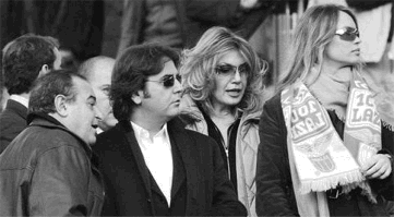 Tribuna d’onore allo stadio Olimpico in occasione di un Lazio-Parma, all’epoca ruggente in cui i biancazzurri erano sponsorizzati dalla Cirio e gli emiliani dalla Parmalat. Billè e Stefano Ricucci sono con le rispettive signore. Ora i due sono indagati perché Billè ha comprato da Ricucci a 60 milioni di euro una palazzina che Ricucci aveva appena preso a dodici. Qui Billè ha le mani in tasca: sta estraendo il libretto degli assegni per pagare a Ricucci i biglietti d’ingresso.