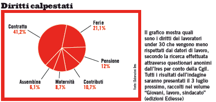 La Cgil sfida un tab?. E chiede agli under 30 come vorrebbero essere difesi sul lavoro. Ne esce un quadro a sorpresa. Eccolo Per celebrare il suo centenario, la Cgil ha avuto una coraggiosa pensata: fare un'indagine sul lavoro giovanile, e chiedere ai ragazzi come giudicano il sindacato. Il presidente dell'Istituto di ricerche economiche e sociali, Agostino Megale, ha messo in piedi l'operazione (vedi riquadri) pur sapendo che gli under 30 non avrebbero ecceduto in applausi. E infatti. Dai dati raccolti, emerge che una parte dei giovani considera il sindacato troppo ideologizzato. Un'altra parte dice che costa eccessivamente. Un'altra ancora, pensa che non si occupi abbastanza dei ragazzi. E c'? persino chi pronuncia il terribile aggettivo: "Inutile". Messa cos?, tranchant, potrebbe sembrare una bocciatura. E in parte lo ?. Ma in Cgil non si scompongono; anzi, interpretano questo segnale, tanto forte quanto parziale, come un rinnovato dialogo con la societ?: "? un fatto", dice Megale, "che negli ultimi anni il nostro sindacato ha saputo creare un solido legame con i giovani. La riprova pi? eclatante ? stata la manifestazione del 23 marzo 2002 per l'articolo 18. Il resto ? nato con i movimenti per la pace". Partendo da questa consapevolezza, continua, "abbiamo trovato la forza per verificare cosa i giovani pensassero di noi. Approfondendo, in parallelo, come i ragazzi affrontano la realt? precaria e le contraddizioni della legge 30, battendosi per un'identit? sociale troppo spesso negata". A corredo della spiegazione, la Cgil specifica che negli ultimi anni le iscrizioni dei giovani sono aumentate. Ma dati in merito, per il momento, non ce ne sono. C'? invece nella ricerca (che verr? pubblicata il 3 luglio, titolo 'Giovani, lavoro, sindacato', edizioni Ediesse) una brillante immagine degli under 30 coniata dal sociologo Aldo Bonomi: generazione senza libro. "Quella di oggi", sostiene Claudia Pratelli nello studio, ? una societ? sempre pi? secolarizzata, senza 'testi sacri' di riferimento, in cui il problema dei fini e dei valori si pone in modo diverso: fuori dalle ideologie". Le nuove generazioni, insomma, "stanno scrivendo il loro libro dentro i percorsi di vita, di socialit? e di lavoro. Una rottura epocale rispetto alle fasi storiche precedenti, da cui proviene lo iato tra il linguaggio e le stesse categorie analitiche della politica e delle istituzioni, ormai datate, e la nuova grammatica che proviene dai giovani". Concetti alti che si traducono brutalmente in tabelle e percentuali. Il 24 per cento del campione intervistato, ad esempio, sostiene che a limitare la "capacit? di rappresentanza dei giovani", nel sindacato, ? l'organizzazione burocratica. Un altro 23,3 critica la scarsa presenza di giovani sulle poltrone che contano. Mentre il 17,3 sottolinea lo scarso contatto con il mondo atipico. Giudizi tosti e costruttivi, li considerano alla Cgil. Come quelli sulla sua attivit? degli ultimi anni. Se il 35,9 per cento risponde infatti che ? stata "positiva", c'? un 33,2 che la considera "n? positiva n? negativa", mentre il 5,6 fa un bilancio rigorosamente "negativo". La domanda, a questo punto, ?: cosa fare per migliorare il rapporto tra sindacato e giovani? "Esserci", dice Megale: "Non limitarsi a denunciare situazioni estreme o categorie a rischio, ma agire ai tavoli di trattativa. Certo, il quadro complessivo ? drammatico. Negli ultimi due anni il 50 per cento dei nuovi assunti sono con contratti a termine. A questi vanno aggiunti un milione di collaboratori e 300 mila interinali. Nel complesso tre milioni di persone che chiedono aiuto, senza contare i famigliari che li assistono. Naturale che ci sia malessere. E naturale che si chieda al sindacato un sostegno, alla svelta". Non a caso, spiega l'inchiesta dell'Ires, molti sono i diritti che stando ai giovani non vengono rispettati sul posto di lavoro. Secondo il 41,2 per cento del campione, ad esempio, si viola una cosa non proprio secondaria come il contratto. Per il 21,1 per cento non si rispettano le ferie. E il 10,7 denuncia problemi sui contributi, con un rimanente 6,1 che segnala il mancato rispetto delle assemblee. "Gli anni Ottanta e Novanta", commenta Paolo Nerozzi, membro della segreteria Cgil, "hanno distrutto il rapporto tra giovani e impegno sociale. Chi gestisce il mercato ne ha approfittato, e adesso ? dura recuperare". Per fortuna, continua, "i ragazzi stanno ritrovando energia, coesione. Ma ? il sindacato che non sempre ? all'altezza. Accoglie le istanze generali, e stenta sui singoli casi". A riguardo, il neo ministro delle Politiche giovanili Giovanna Melandri, ha una sua proposta. Per non abbandonare i giovani, spiega, "? necessaria una collaborazione trasversale, persino un'alleanza, con molti ministeri: quello del Lavoro, dell'Universit? e anche delle Comunicazioni". Al primo posto tra gli obiettivi mette "una legge quadro per le politiche giovanili, senza tentazioni pedagogiche o dirigistiche". E intanto auspica un'azione congiunta con i sindacati, per studiare nuove e pi? efficaci regole. "La flessibilit?", sostiene, "serve anche ai ragazzi", ma "la precariet? ? il loro incubo principale". Parole che sono miele, per chi comanda nel sindacato. Proprio l'instabilit?, soprattutto tra i giovanissimi, viene vista infatti come causa scatenante della mancata iscrizione. Cos? si spiega perch? tra i 17 e i 24 anni solo il 22,9 per cento dei ragazzi ha una tessera in tasca (contro il 70,6 che non ce l'ha e un curioso 6,4 di ex iscritti). E perch?, arrivando alla pi? solida fascia dei 25-32, ci sia un netto miglioramento, con il 47,6 per cento che entra nelle file del sindacato. Il senso generale rimane per? identico. I giovani, dimostra la ricerca Ires, sono comunque spaesati. E quantomai spaccati. Per un 30,1 per cento che ritiene la globalizzazione una cosa buona, sempre se "ispirata ai valori della solidariet? e dei diritti", c'? un 30,3 che la considera uno "strumento di dominio nella mani dei paesi ricchi". Stes