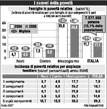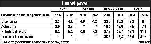 Pagina 8 - Interni Al Nord colpiti i giovani, al Sud tutti WORKING POOR In Italia i poveri sono 7 milioni e 577 mila. Il 13,1% dell’intera popolazione, l’11,1% delle famiglie residenti. Rispetto al 2004 non sono aumentati n? diminuiti. Semmai sono cambiati. Al nord soprattutto. Dove essere poveri, secondo un’indagine dell’Istat presentata ieri a Roma, significa sempre pi? essere giovani, con un lavoro dipendente e un titolo di studio medio alto. Tecnicamente sono chiamati working poor. Rappresentano una fetta della popolazione che lavora per un salario che li colloca al di sotto del livello di povert? (una soglia convenzionale che individua il valore di spesa per consumi pari a 936,58 euro al mese). Un fenomeno presente soprattutto al nord dove, in un solo anno, le famiglie povere con a capo un giovane con meno di 35 anni sono passate dal 2,6% al 4,8% e quelle con a capo un lavoratore dipendente da 3,5% a 4,2%. Eppure, a livello nazionale, i fattori che concorrono a determinare la povert? sono di tutt’altra natura: un elevato numero di familiari, la presenza di figli - soprattutto se minori -, quella di anziani, cos? come un basso livello di istruzione e una ridotta partecipazione al mercato del lavoro. Nel sud dove risiedono il 70% della famiglie povere italiane, la figura dell’indigente risponde a questa tipologia. In generale, le famiglie con cinque o pi? componenti presentano livelli di povert? pi? elevati: in Italia il 26,2% di queste famiglie vive in povert?, il 39,2% sono nel Mezzogiorno del Paese. Scendendo nel dettaglio regionale, la povert? relativa risulta meno diffusa in Emilia Romagna (2,5%), in Lombardia, in Veneto e nella provincia di Bolzano (tutti inferiori al 4,5%). Pi? elevate sono le incidenze osservate in tutte le altre regioni del centro-nord: dal 4,6% della Toscana al 7,3% dell’Umbria. La situazione pi? grave ? quella delle famiglie campane (l’incidenza ? del 27%) e siciliane (30,8%). Le difficolt? economiche si fanno ancor pi? evidenti quando ci sono figli minori. L’incidenza di povert?, che ? pari al 13,6% se in famiglia ci sono due figli e al 24,5% se i figli sono tre o pi?, sale rispettivamente al 17,2% e al 27,8% quando i figli sono di et? inferiore ai 18 anni. Al sud ? povero circa il 42,7% delle famiglie con tre o pi? figli minori. Livelli di povert? superiori alla media si riscontrano, invece, tra i genitori soli (13,4%), in particolare nel nord, dove le famiglie monogenitore povere sono il 5,8% contro una media ripartizionale del 4,5%. Anche la popolazione anziana, meno povera rispetto al 2004, mostra un disagio diffuso: tra le famiglie con almeno un anziano l’incidenza di povert? (13,6%) ? superiore di oltre due punti percentuali alla media nazionale e sale al 15,2% tra quelle con almeno due ultrasessantaquattrenni. C’? anche un legame tra povert? e lavoro: oltre un quarto delle famiglie con almeno una persona in cerca di occupazione vive in povert? relativa e si sfiora addirittura il 40% se a cercare lavoro sono due o pi? persone. E mentre il ministro per la Solidariet? sociale Paolo Ferrero parla di una ?situazione drammatica? per large fasce della popolazione che ?la Finanziaria aiuter?, c’? da ricordare come in Italia 1 famiglia su 10 (1 su 5 solo al Sud) viva al limite della soglia. Statisticamente non rilevate, socialmente disagiate. |