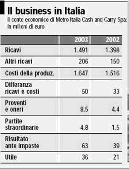 Dal bilancio 2003 di Metro Italia Cash and Carry Spa emerge che la crescita dei ricavi a 1,697 miliardi (+6,6%), al netto dei 39,384 milioni del punto vendita di Parma, ha coperto poco più dell'inflazione.