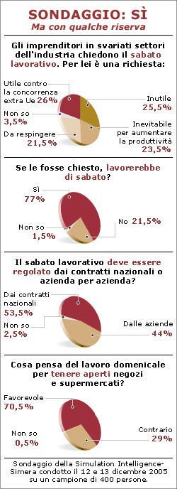 Da qui l'affondo della Confindustria, soprattutto dopo la firma di un accordo sulla flessibilità degli orari, oltre che sulle regole di applicazione della legge Biagi, per i dipendenti delle telecomunicazioni. «È evidente che chi si vede ordinare di lavorare di sabato, e non lo aveva previsto, non gradisce. Il sabato libero è una conquista sociale, lo capisco, e nessuno lo vuole cancellare» ha riconosciuto in un'intervista al Sole 24 Ore Alberto Bombassei, vicepresidente della Confindustria, lanciando la proposta di rendere più facile il ricorso al lavoro nei finesettimana. Subito ha aggiunto: «Però non deve essere nemmeno un tabù».