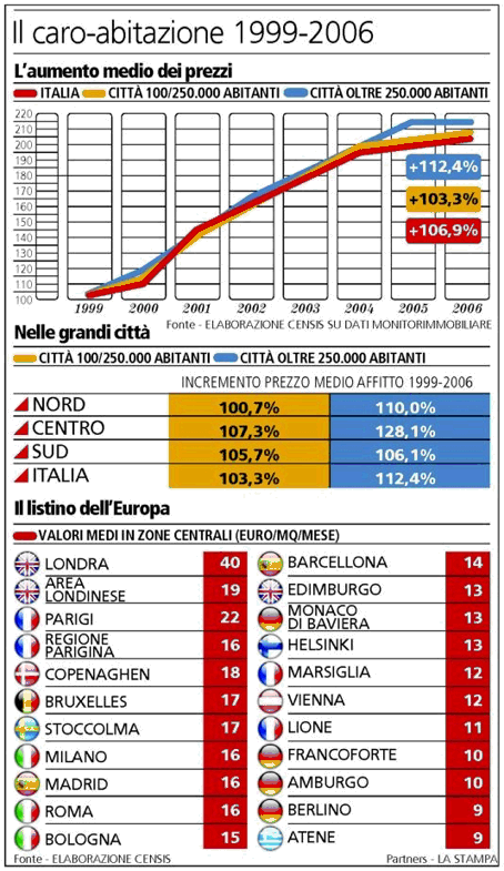 Veniamo alla crescita dei prezzi. Tra il 1999 e il 2002 c’è stata un’impennata dei canoni del 62%, dal 2003 al 2006 del 18,6% nelle grandi città e del 13,4 nei centri più piccoli. Una tendenza che ha portato ad incrementi sull’intero periodo nei grandi agglomerati urbani del 128,1% al Centro (dove i canoni sono continuati a salire in misura rilevante anche negli ultimi quattro anni), 110% al Nord e 106,1% al Sud, per una media del 112,4%; nei centri tra 100 e 250 mila abitanti rispettivamente del 107,3%, 100,7%, 105,7% e 103,3%.