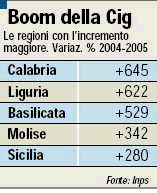 ITALIA LAVORO - pagina 20 I valori cumulati sino al mese di febbraio confermano l'incremento, con un + 15,68% ( 13.017.765 ore). La regione che ha avuto una crescita maggiore è, nel raffronto febbraio febbraio, la Calabria, con + 645,18%, seguita dalla Liguria (+ 621,79%), dalla Basilicata (+ 529,30%), dal Molise (+ 343,84%), dalla Sicilia (+ 280,36%). In calo invece la Cig in Piemonte ( 10,56%), Lombardia (10,37%), Emilia Romagna ( 22,05%), Campania ( 15,34%). Se si guardano i valori cumulati fino al mese di riferimento la variazione più consistente si è registrata in Basilicata (+ 1.102,60%), seguita dalla Calabria (+ 224,15%), dal Molise (+ 168,17%), dalla Sicilia (+ 96,39%). Il calo più consistente è stato invece della Valle D'Aosta con 47,41 per cento. In diminuzione la cig per quanto riguarda gli impiegati dell'industria ( 6,44% nel raffronto febbraio febbraio, 9,36% i valori cumulati). Gli interventi straordinari per gli operai sono stati invece pressoché stazionari con un + 1,57% nel raffronto tra febbraio e febbraio e un + 2,61% se si prendono in considerazione i valori cumulati fino a febbraio. Rispetto all'anno precedente la regione che ha registrato un deciso incremento del ricorso alla Cigs è il Trentino Alto Adige (+ 1.154,24% nel raffronto tra i due mesi in considerazione, + 1.541,58% rispetto ai valori cumulati), seguito dalla Lombardia (+ 253,73%, 76,46%) e dal Piemonte (+ 179,60%, 124,40%). In calo invece la Cigs in Emilia Romagna ( 69,31%, 58,79%), Lazio ( 43,31%, 20,29%), Sicilia ( 17,10%, 16,92%), Sardegna ( 94,91%, 86,05%), Marche ( 57,10%, 13,64%), Puglia ( 23,53%, 41,93%). L'incremento complessivo degli interventi ordinari e straordinari nel Paese è stato nel 2005 ( valori cumulati fino a febbraio) del 7,07%, dell' 8,26% nel raffronto febbraio 2005 febbraio 2004. |
