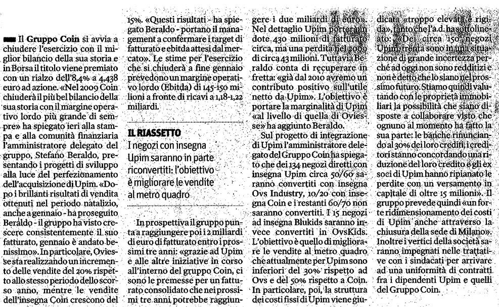 Coin-Upim verso 2 miliardi di ricavi