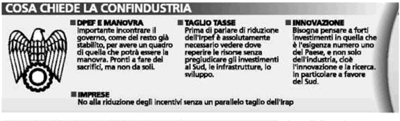 Intesa c'è invece, come detto, sul timore per gli effetti sull'economia della manovra appena varata, e per i fortissimi dubbi sulla praticabilità del taglio delle tasse. Per Montezemolo, «è già difficile trovare 7 miliardi, non vorrei che fossimo costretti a trovare altre risorse che metterebbero a rischio lo sviluppo». Così come tutti e due puntano il dito più o meno usando le stesse parole sulle difficoltà della politica: la maggioranza che fa fatica a governare, l'opposizione a mettere a punto un progetto vero e forte alternativo. Ma il presidente di Confindustria fa capire che non ha nessuna intenzione di aprire fronti polemici con l'Esecutivo. «Questo è un paese - dice - che non può uscire dai problemi ricorrendo sempre alle elezioni. Ma di certo sarebbe deleterio se avessimo di fronte due anni di immobilismi e tatticismi. Mi auguro - è la conclusione di Montezemolo - che chi è al governo governi, assumendosi le sue responsabilità e decidendo laddove bisogna prendere decisioni».