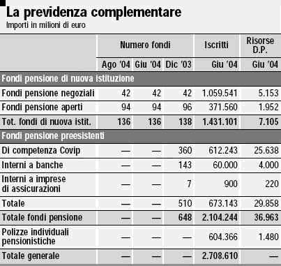 A inizio anno obiettivo 30%. L'obiettivo minimo del Governo è di far salire nel 2005 il tasso di adesioni alla previdenza complementare dall'attuale 12 al 30 per cento. Per tagliare questo traguardo il Governo potrebbe varare a gennaio un primo decreto di attuazione della riforma previdenziale (ma senza le misure sul Tfr). Non è però affatto escluso che questo provvedimento possa vedere la luce a inizio primavera.