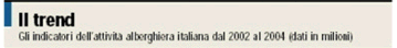 Le altre fonti. Più contenuta la flessione registrata nell’area food & beverage (il 36% dei ricavi alberghieri complessivi) pari a circa 100 milioni. La restante quota del fatturato (il 12% circa) è costituito dalle voci relative a tutte le attività di supporto al soggiorno alberghiero, all’affitto di sale congressuali e ad altri servizi: anche in questo caso compare il segno meno, facendo lasciare sul terreno circa 60 milioni nel triennio 2002-2004.