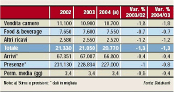 Effetto camere. La contrazione dei ricavi è frutto in prevalenza della performance relativa alla vendita di camere, che costituisce poco più del 50% degli introiti del settore. Questa voce risulta in perdita dell’1,8% sia nel confronto tra il 2002 e il 2003, sia in quello tra le stime di chiusura del 2004 e l’anno scorso. Si è passati dagli 11,1 miliardi del 2002 ai 10,7 previsti nel 2004. La diminuzione si riflette anche sul ricavo medio per camera, che fra il 2002 e il 2003 scende a 47,6 euro (-0,8%).