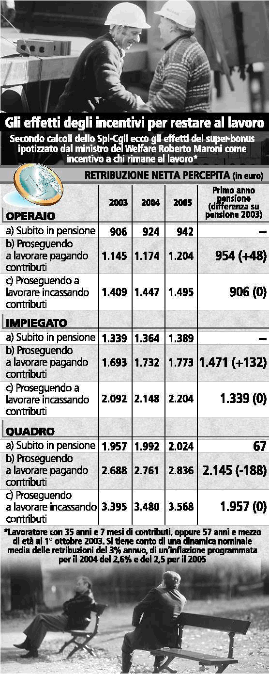 Poi c’è il problema che la riforma, pur se non inserita direttamente in Finanziaria e non presentandosi dunque come una misura per fare cassa, è preannunciata come contemporanea e dunque a tempi brevissimi: «Noi del sindacato avremmo poco tempo per decidere e quindi il confronto sarebbe una farsa», ha commentato Bonanni. Che ha così concluso: «Il governo vuol calpestare il rapporto con le parti sociali. È un'arroganza politica degna di miglior causa». Nei giorni scorsi, Pezzotta e la Cisl avevano ammonito che della riforma Dini non si può discutere prima della verifica prevista nel 2005 e avevano fatto alcune proposte, fra cui di adeguare i contributi dei lavoratori autonomi a quelli dei dipendenti. «Ma per motivi elettoralistici - accusa Bonanni - non vogliono la parificazione e pensano a colpire solo i lavoratori dipendenti».
