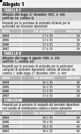 Con riferimento al punto 3, resta inteso che il lavoratore deve maturare i requisiti di età e di anzianità contributiva previsti per il conseguimento della pensione di anzianità secondo le tabelle di cui all’Allegato 1 anche nel caso in cui il regime di appartenenza richieda requisiti più favorevoli (fondo volo, minatori, marittimi). Per i lavoratori dipendenti con cumulo di contribuzione relativa a lavoro autonomo, i requisiti sono quelli esposti nell’ultima tabella dell’Allegato 1.