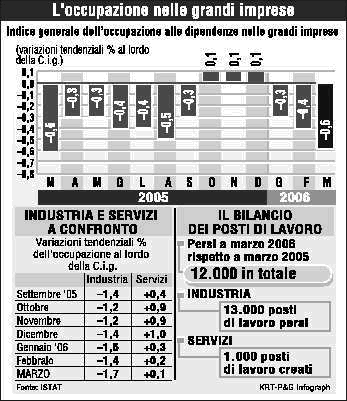 Prosegue il calo dell'occupazione nelle grandi imprese. A marzo, rispetto allo stesso mese del 2005, la variazione lorda dell'indice ha registrato una diminuzione di circa 12.000 posti (-0,6%; -0,5% al netto della cassa integrazione guadagni). Al lieve incremento registrato nelle grandi imprese dei servizi (+1.000 posti) si contrappone una perdita consistente di 13.000 posti nelle grandi imprese dell'industria. Lo rende noto l'Istat, specificando che in termini congiunturali l'indice, al netto della stagionalit?, ha registrato una variazione negativa dello 0,2%, sia al lordo che al netto dei dipendenti in cassa integrazione.
