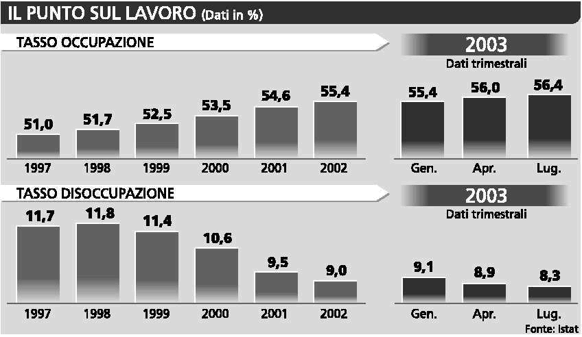 231 MILA POSTI IN PIU’. In un anno, nel confronto con il luglio 2002, i posti di lavoro sono cresciuti di 231.000, ossia +1 per cento; invariati lo sono nel confronto destagionalizzato con la precedente indagine, condotta in aprile. Ma questi 231.000 solo in piccola parte sembrerebbero giovani che hanno trovato un primo impiego; perlopiù sono lavoratori anziani che non l’hanno lasciato. Nei 12 mesi risultano 161.000 occupati in più nella sola fascia di età da 50 a 59 anni: è forse l’aspetto più interessante dell’intera indagine. Il tasso di disoccupazione, sceso in un anno dall’8,7% all’8,3 per cento, è ora inferiore alla media europea; in numero, per la prima volta siamo un filo sotto i 2 milioni, a 1.999.000. E’ una strana onda lunga quella che investe l’Italia: da sette anni (1996) l’occupazione aumenta e ha continuato ad aumentare anche negli ultimi tempi in assenza di crescita economica; da quattro anni (1999) la disoccupazione diminuisce.