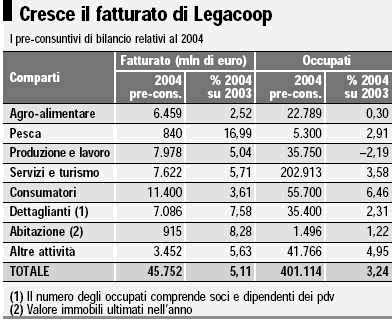 Ma il basso livello della domanda si fa sentire anche sulle cooperative di consumo. In maniera ancora più sensibile, visto che l'aumento del fatturato è passato dall' 11,6% del 2003 al 3,6% dell'anno appena concluso. Anche se, su questo punto, la Legacoop precisa che, a causa delle politiche di " prezzi bloccati" attuati dalla Gdo, il ridimensionamento è stato più rilevante in termini monetari che in volume di vendite. E lo testimonia anche il dato sull'occupazione, in crescita di oltre il 6 per cento.