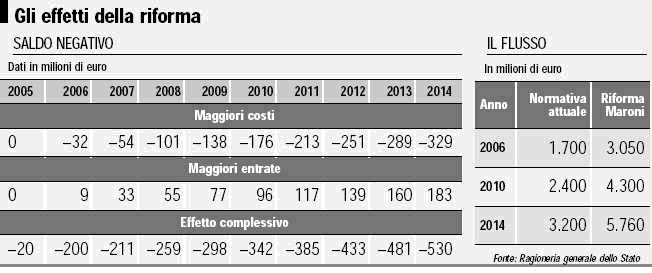 Che, sempre nel 2014, farebbe salire a quota 35% le adesioni alle forme integrative, rispetto al + 24% realizzabile con il meccanismo attualmente in vigore, facendo leva sulla smobilizzazione di un flusso di Tfr di 5,7 miliardi ( 3 miliardi nel prossimo anno). L'effetto negativo sui conti pubblici sarà progressivo: si parte da un " rosso" di 200 milioni nel 2006 per poi crescere a quota 259 nel 2008 ( quando scatteranno le nuove misure per la previdenza obbligatoria) e a 530 milioni nel 2014. A evidenziarlo è la relazione tecnica allo schema di decreto legislativo inviato dal Governo alle Camere, che è stata firmata al Ragioniere generale dello Stato.
