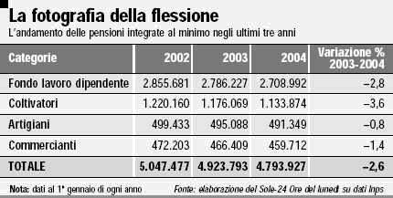 Sorpresa. Le pensioni integrate al minimo diminuiscono in misura rilevante: dal 2002 al 2004 sono oltre 250mila in meno. I motivi sono diversi e di segno differente. In primo luogo, ha influito un certo inasprimento delle regole a partire dall'inizio degli anni '90, quando sono entrate in vigore, in un breve lasso di tempo, una serie di norme che hanno reso più difficile la possibilità di avvalersi dell'integrazione al minimo.