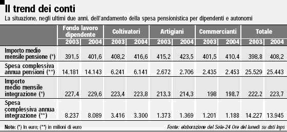 I conti. La spesa complessiva per i trattamenti minimi è elevata e sufficientemente stabile, nonostante il minor numero delle prestazioni: nel 2004, su ben 25 miliardi di euro per le gestioni dell'assicurazione generale obbligatoria (dipendenti e autonomi Inps), quasi 14 miliardi sono stati destinati all'integrazione (e perciò a carico dei trasferimenti statali).