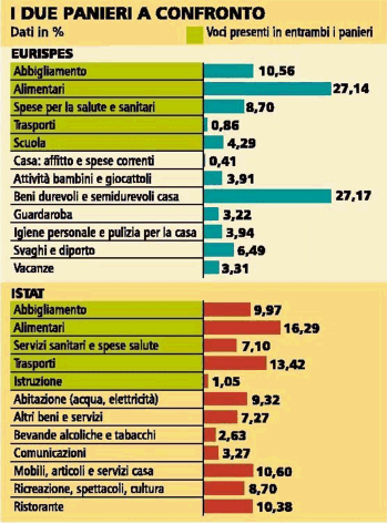 La prima grande differenza del paniere Eurispes rispetto a quello Istat è che qui non compaiono beni di lusso (sigarette estere, garage, taxi, aerei, imbarcazioni, manifestazioni sportive, luna park, stabilimenti balneari, discoteche, lotterie, libri non scolastici, ecc.). La seconda differenza è che alcuni consumi, elencati nel paniere Istat, come bar e ristoranti, cinema, teatri sono poco o nulla presenti in quello Eurispes. La terza è che si ipotizza che la famiglia paghi l'affitto (o un mutuo per la casa).