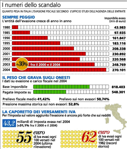 La ricerca rivela che è addirittura dal 1989 che la pressione reale viaggia sopra il 50%, con un picco del 55% nell’anno dell’Eurotassa, il 1997. Le stime del 2004, l’ultimo anno per il quale sono disponibili tutte le variabili, parlano di una base imponibile effettiva di 818.403 miliardi e di tasse pagate solamente su 548.301 miliardi di euro.
