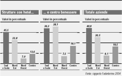 Cresce sempre di più l’interesse degli operatori esteri per il business alberghiero legato al benessere: la catena tedesca Kempinski ha sviluppato nel Trapanese un resort distante dal mare puntando sui servizi wellness, il gruppo francese Accor ha realizzato un centro di thalassoterapia in Sardegna, la spagnola Ifa sta rilanciano il complesso termale di Galzignano. Per il polo piemontese di Acqui (che rientra nell’area delle Olimpiadi invernali di Torino 2006) è in pista un progetto da 107 milioni dell’architetto giapponese Iwakiri Shigeru in collaborazione con la Tange associates di Tokyo: previsto anche un albergo di 23 piani con centro termale (40 milioni).