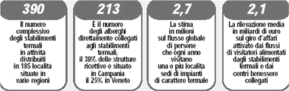 L’industria turistica termale — stima il Rapporto — conta 390 stabilimenti nel complesso, in 185 località, e le regioni leader sono Emilia-Romagna, Veneto, Toscana e Campania. Le strutture alberghiere collegate direttamente agli stabilimenti termali sono 213 con oltre 16.500 camere; il Rapporto (curato da Mercury per Federterme) ha poi censito 215 centri benessere di rilevo in attività presso complessi e alberghi termali. Il turismo legato al termalismo è stimato in oltre 2,7 milioni di persone all’anno per un volume d’affari complessivo di 2,1 miliardi. Le terme italiane — secondo Unioncamere-Isnart — rapresentano il 21,6% dei pacchetti vacanze venduti all’estero dai tour operator internazionali, e il 6,2% del loro fatturato.