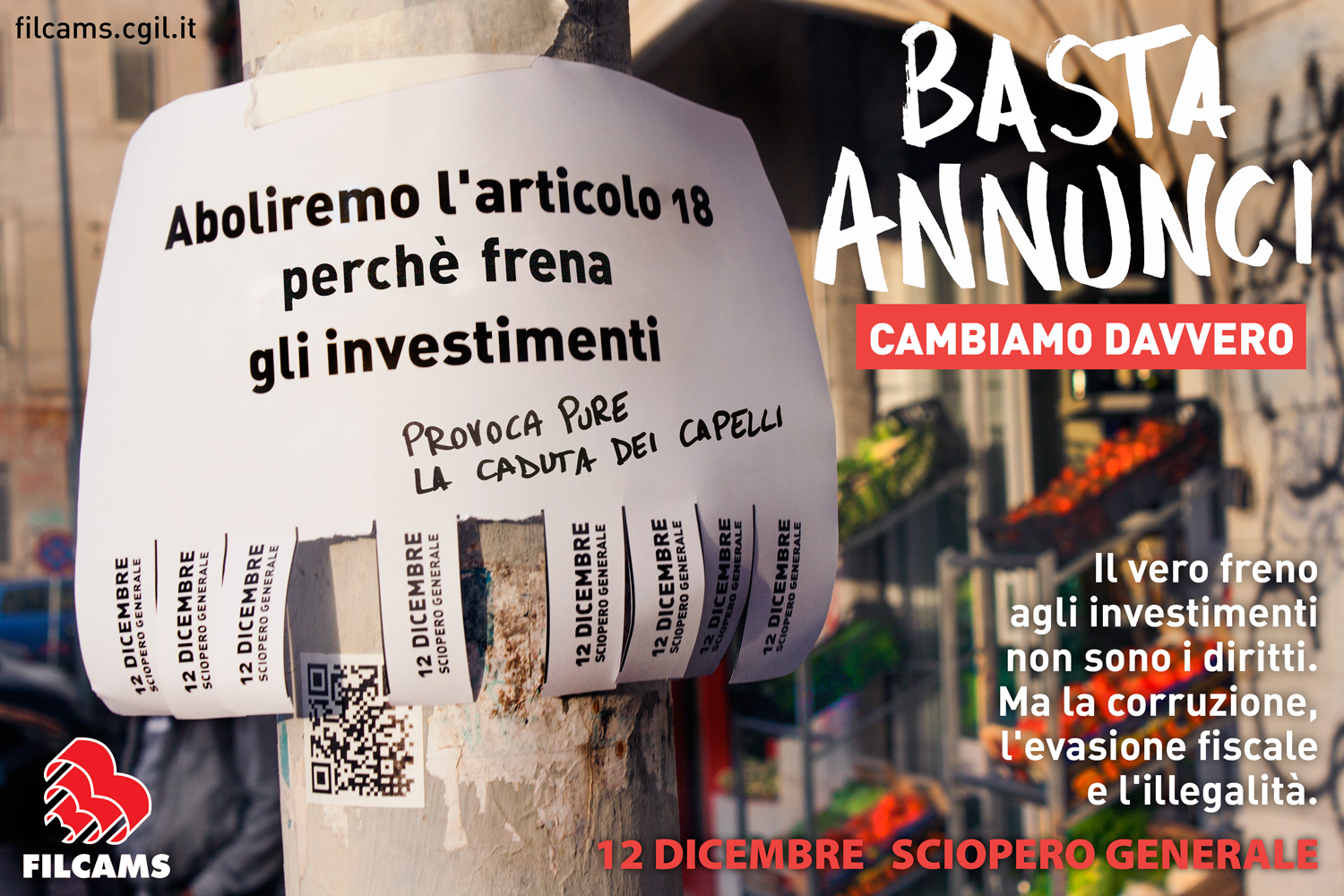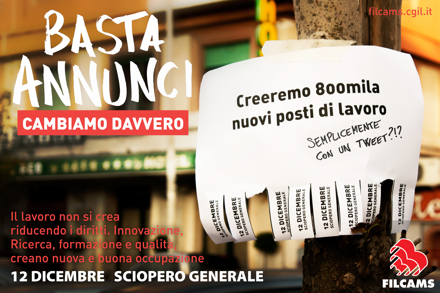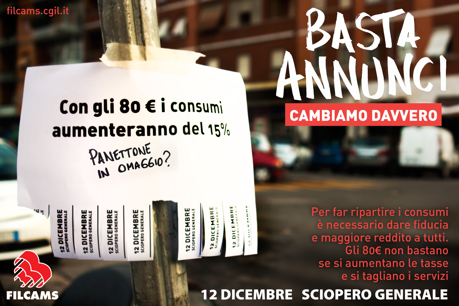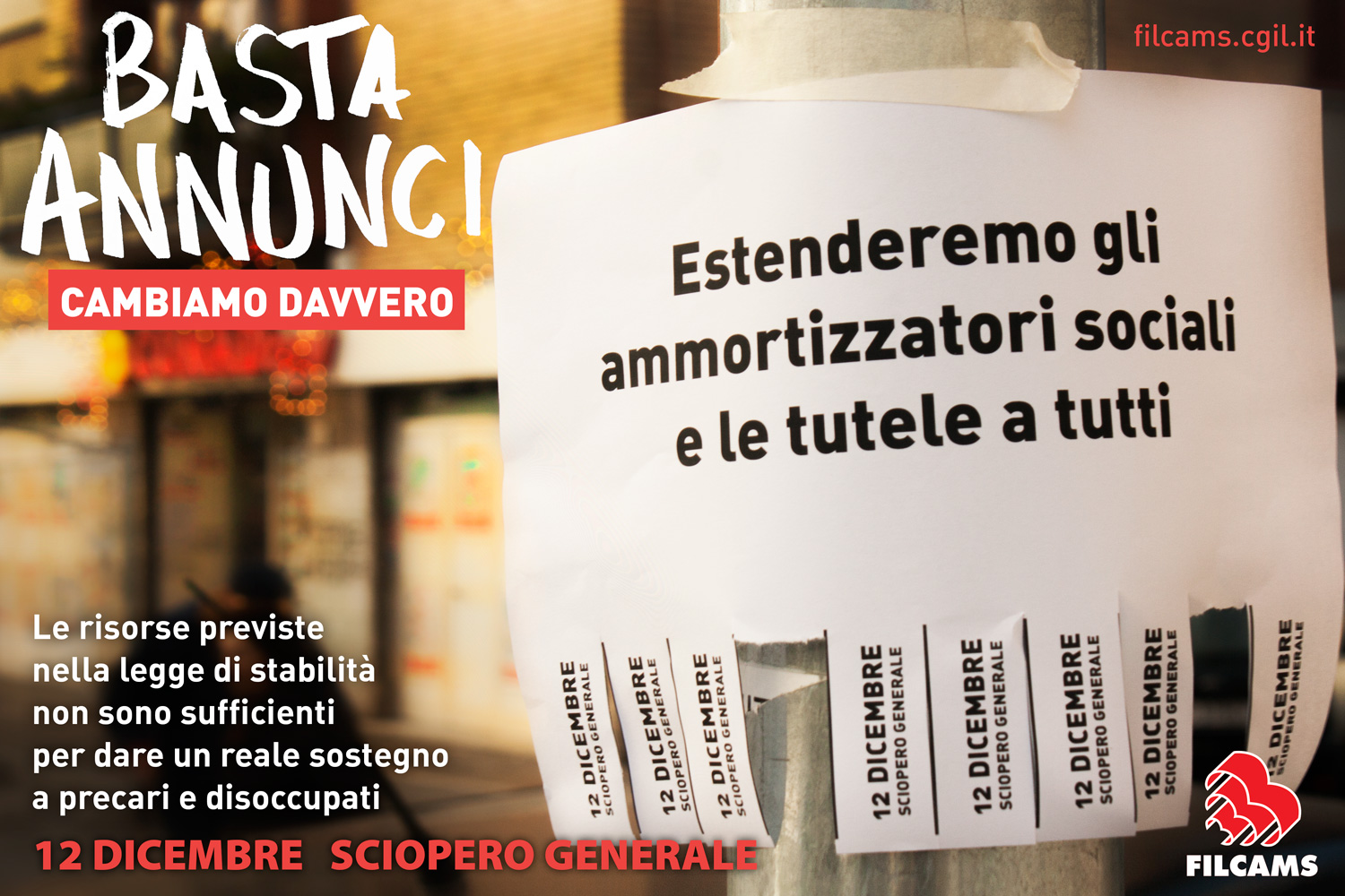 Basta Annunci Cambiamo davvero, è la campagna di comunicazione lanciata dalla Filcams Cgil che aderisce allo sciopero e alle iniziative organizzate a livello territoriale. Sono in programma 54 manifestazioni: 10 regionali; 39 provinciali; 5 interprovinciali.