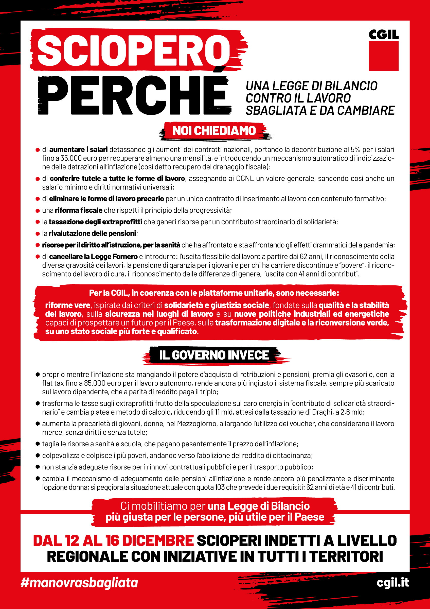 La finanziaria del nuovo Governo penalizza la sanità e la scuola, che avrebbero invece bisogno di un maggiore sostegno; va a colpire le fasce più disagiate della popolazione premendo per l'abolizione del reddito di cittadinanza; non stanzia risorse adeguate per i rinnovi dei contratti nazionali e per il trasporto pubblico; introduce un meccanismo di adeguamento delle pensioni all'inflazione che, ancora una volta, penalizza le fasce più povere e modifica, peggiorandola, l'opzione donna.