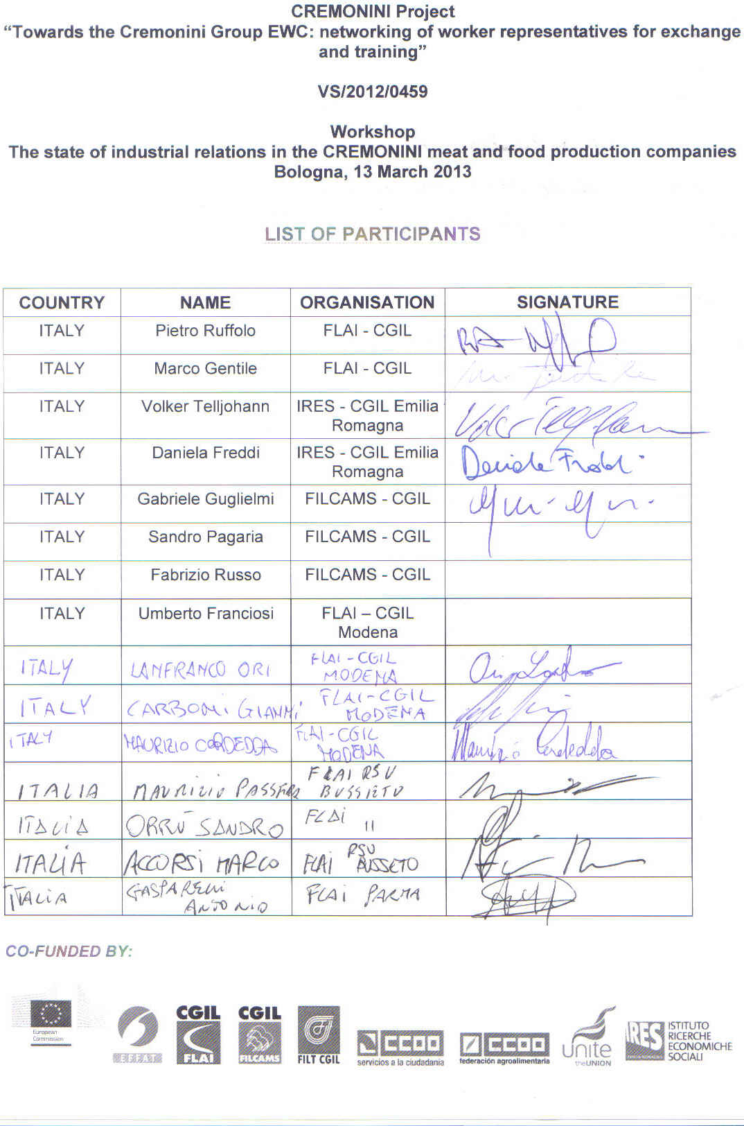 Nell’ambito del Progetto Europeo “Verso la costituzione del CAE multisettoriale nel Gruppo Cremonini” il 13 marzo 2013 si é tenuto a Bologna il primo workshop dedicato al settore della produzione.