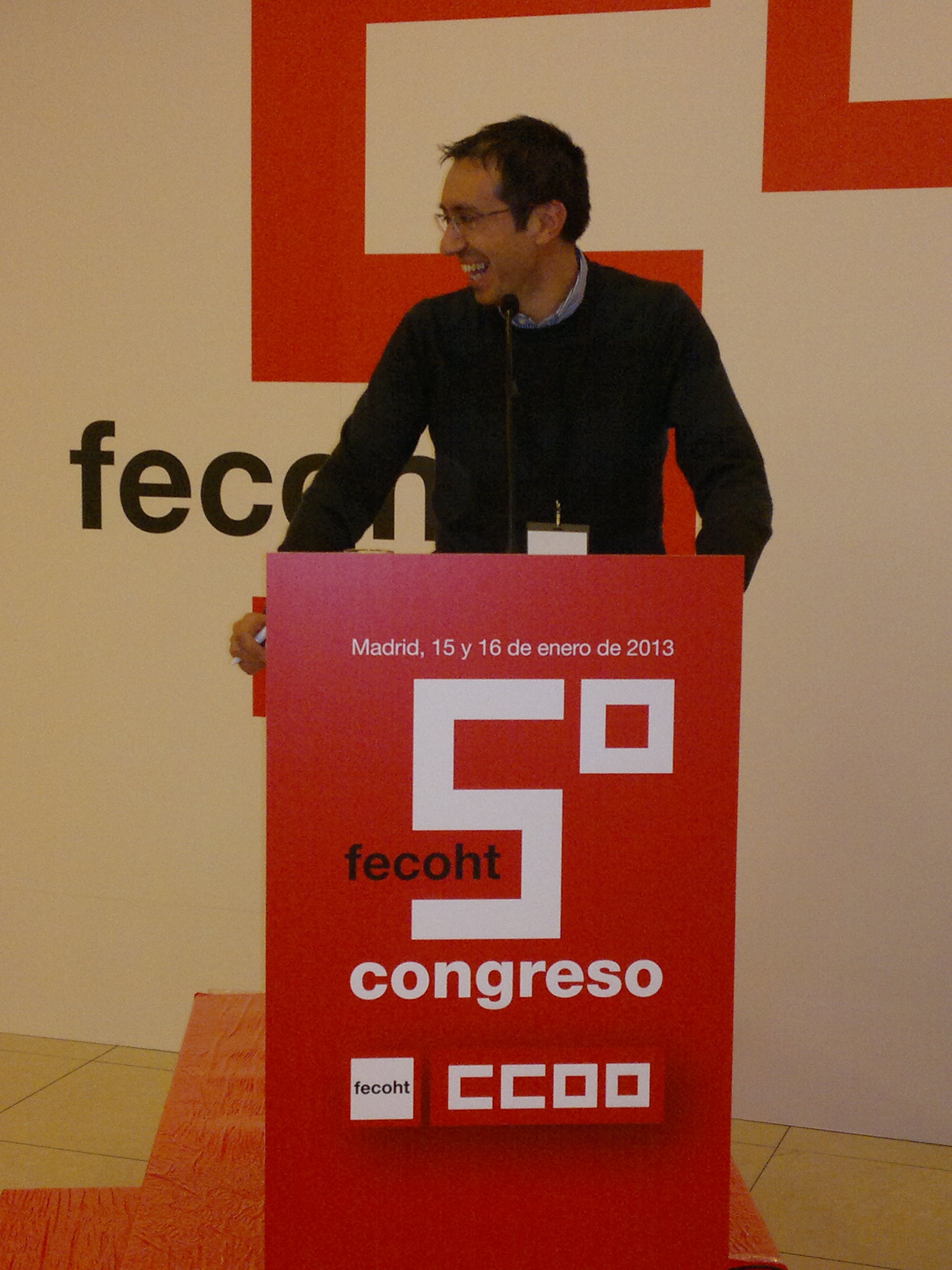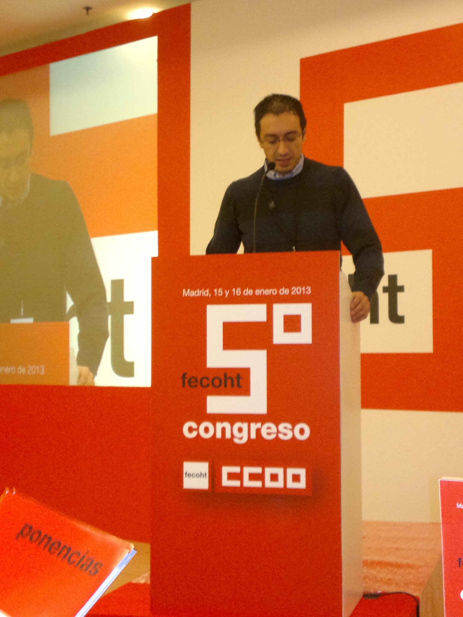 Dopo le procedure iniziali sono arrivati i saluti della UITA portati dal compagno Massimo Frattini, segretario del turismo nell'organizzazione mondiale. Terminati i saluti della delegazione internazionale e della federazione madrilegna di Madrid, che ospita il congresso, si è entrati nel vivo di questo momento di democrazia che è il congresso di FECOHT. Il primo atto è stato scandito dalla voce di Ignacio Fernández Toxo, segretario generale della confederazione, che ha dipinto il duro quadro della crisi internazionale e spagnola. A seguire è intervenuto il segretario generale di FECOHT, con la sua relazione politica.