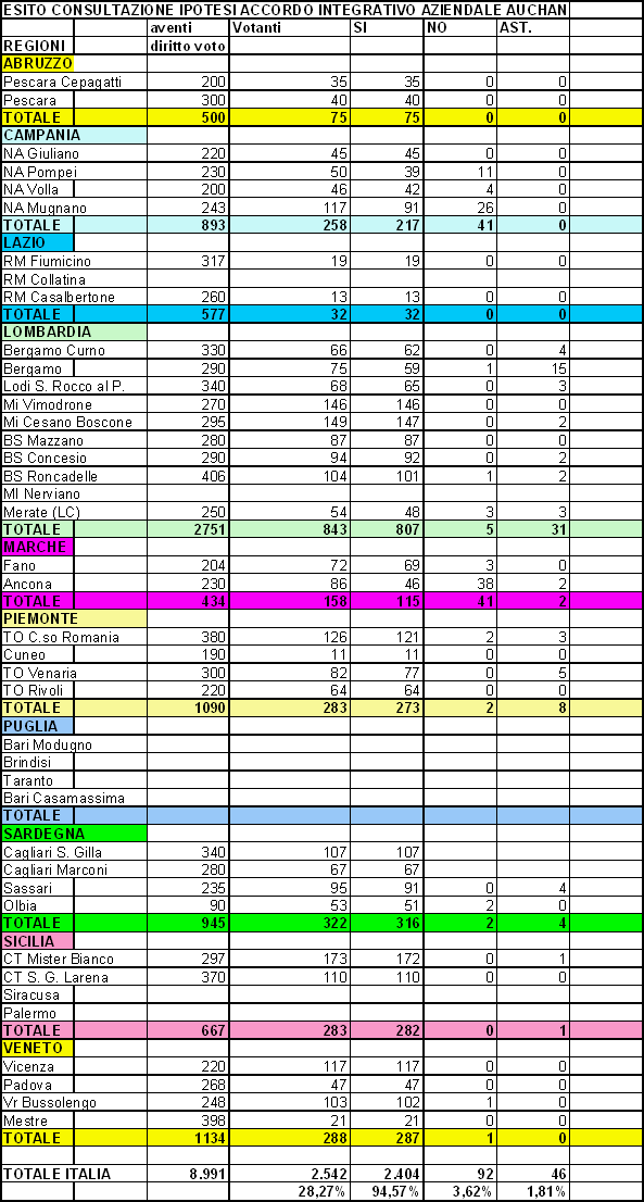 nella mattinata di ieri è stato siglato il testo definitivo di rinnovo del Contratto Integrativo della Auchan SpA sulla base della consultazione svoltasi nei mesi passati che ha visto complessivamente coinvolti nelle assemblee 2.542 lavoratrici e lavoratori che hanno approvato l’ipotesi siglata il 5 giugno con 2.404 voti a favore, 92 voti contrari e 46 astenuti. In allegato Vi trasmettiamo il riepilogo della consultazione in base ai verbali pervenuti alle segreterie Nazionali e il testo del nuovo contratto integrativo.