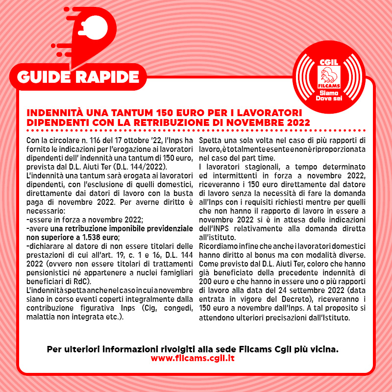 Bonus di 150 euro per i lavoratori dipendenti con la retribuzione di novembre 2022